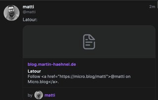 .@manton Is there a way to control what's in the "description"(?) of a blog post shared to mastodon? I mean that "Follow on micro blog" part.